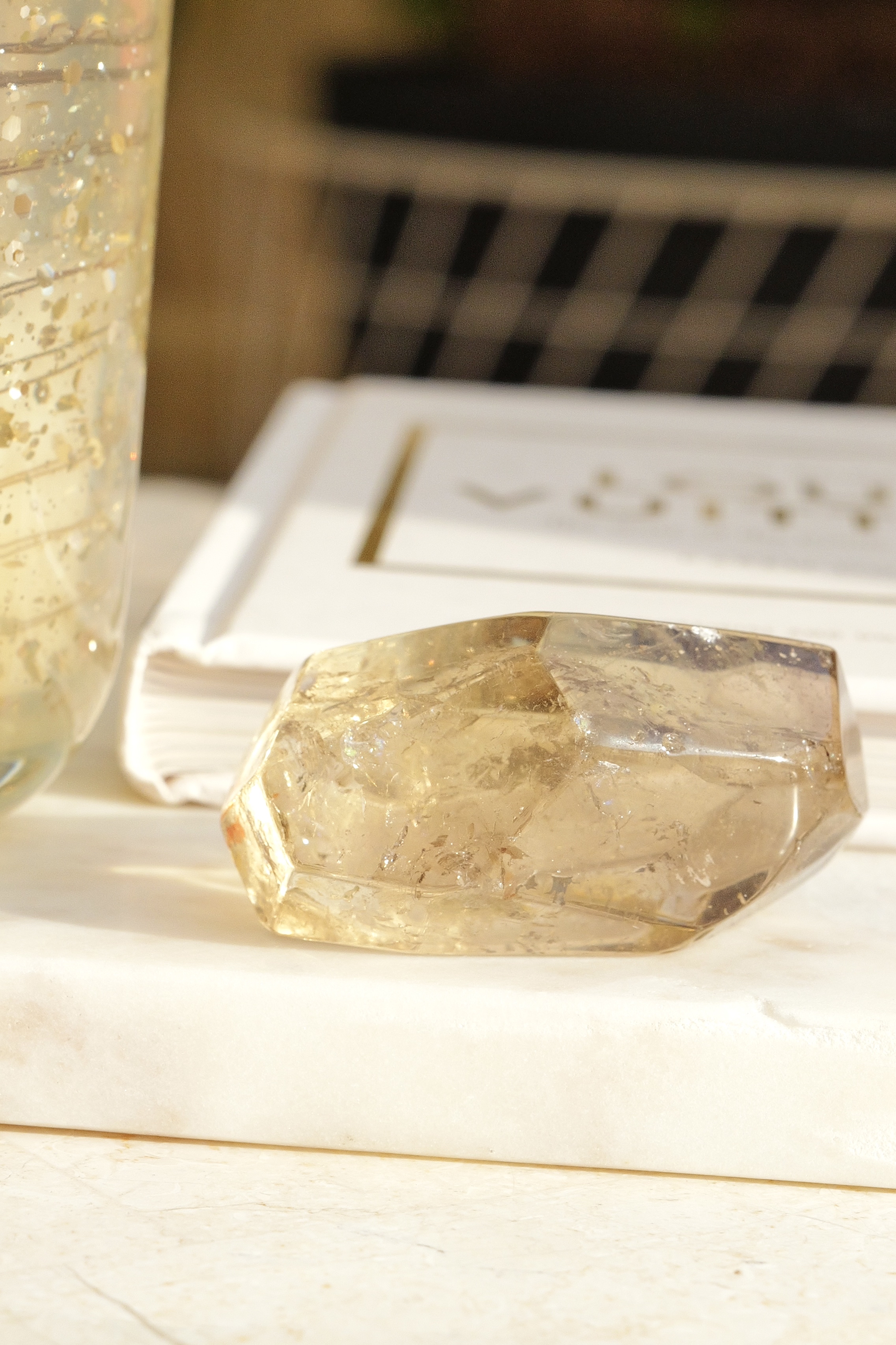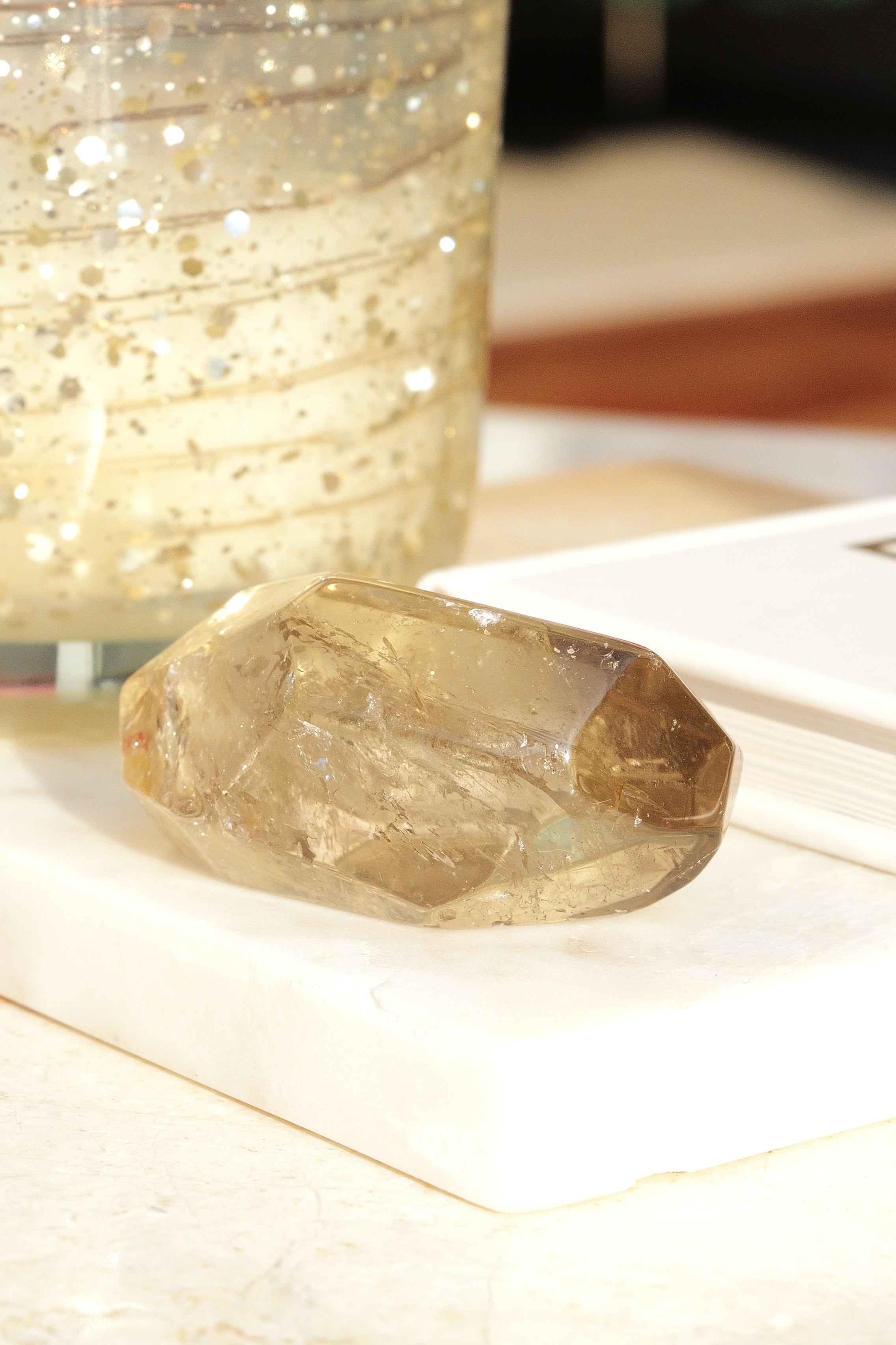*光敏高的晶體,在光學折射下會呈現出不同色彩濃度,暗光下濃調,光源充足為淡黃,可依據自然光拍攝之影片為標準色彩